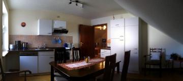 - Küche mit Essplatz und Backofen, Cerankochfeld, Kühl-Gefrierschrank, Spülmaschine, Kaffeemaschine, Wasserkocher, Allesschneider, Mixer, Toaster, Mikrowelle